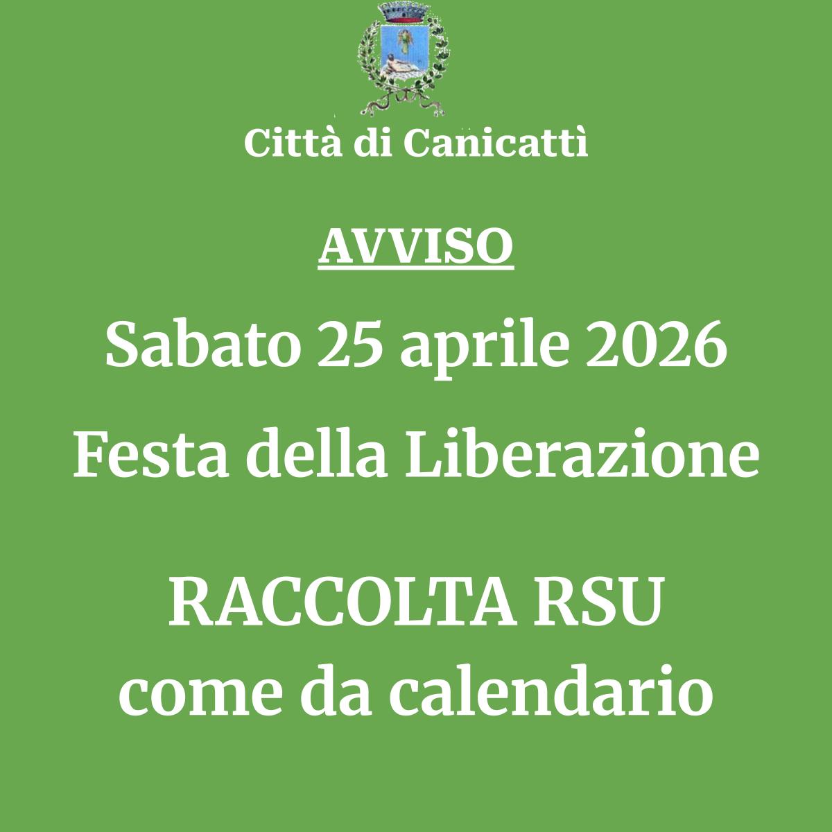 Informiamo che sabato 25 aprile il servizio di raccolta dei rifiuti porta a porta sarà regolarmente effettuato come da calendario.