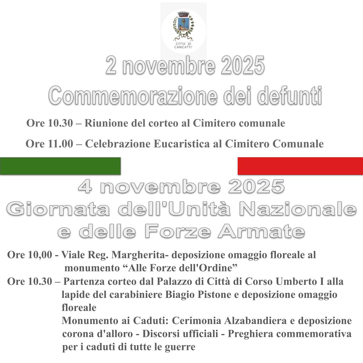 Ore 10.30 – Partenza corteo da Palazzo di Città di Corso Umberto I° alla lapide del Carabiniere Biagio Pistone e deposizione omaggio floreale Monumento ai Caduti: cerimonia dell' alzabandiera, deposizione corona d'alloro - Discorsi ufficiali - Preghiera commemorativa per i caduti di tutte le guerre.
