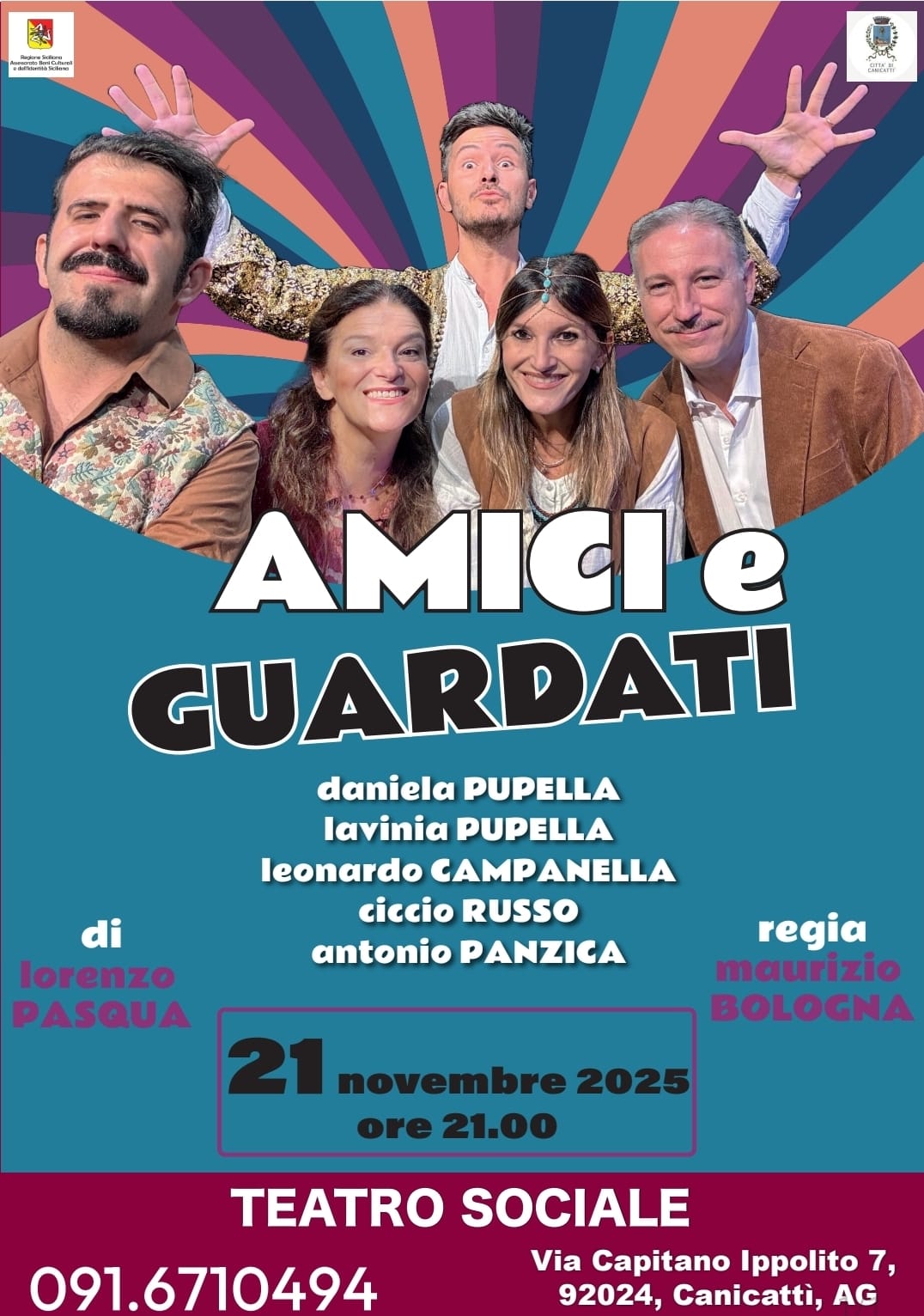 Venerdì 21 novembre, alle ore 21, al Teatro Sociale, la Compagnia Pupella presenta "Amici e guardati" di Lorenzo Pasqua con la regia di Maurizio Bologna. Spettacolo patrocinato dalla Regione Siciliana e dal Comune di Canicattì. Vi aspettiamo