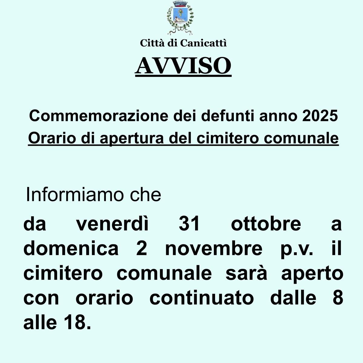 da venerdì 31 ottobre a domenica 2 novembre p.v. il cimitero comunale sarà aperto con orario continuato dalle 8 alle 18.